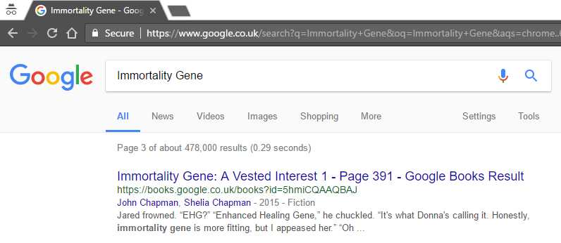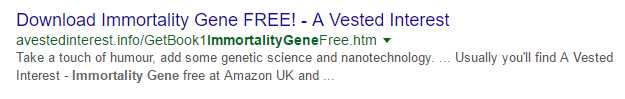 If I type in the series title of this book also - 'A Vested Interest Immortality Gene' I find it as number 1, 2, 3, 4, 5, 6, 7, 8, 9 and 10 of the first page of search results. OK, that's pretty good but who is going to enter the book series also in a search? I needed to do some SEO - Search Engine Optimisation to bring my 'Immortality Gene' references to the first page of search results.