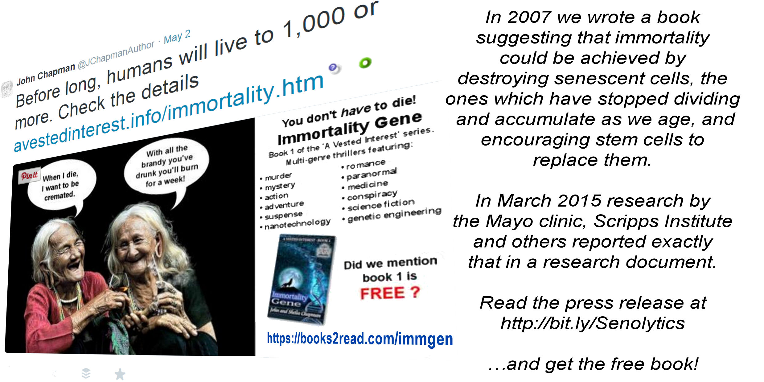 The result is 'Immortality Gene', the first in a novel series by John and Shelia Chapman. The ebook of book 1 is FREE and available at multiple retailers