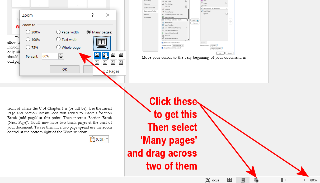 If your computer shows only a single page spread instead of the two page one above then at the bottom right of the Word window click the percentage shown and follow the numbered steps shown here.