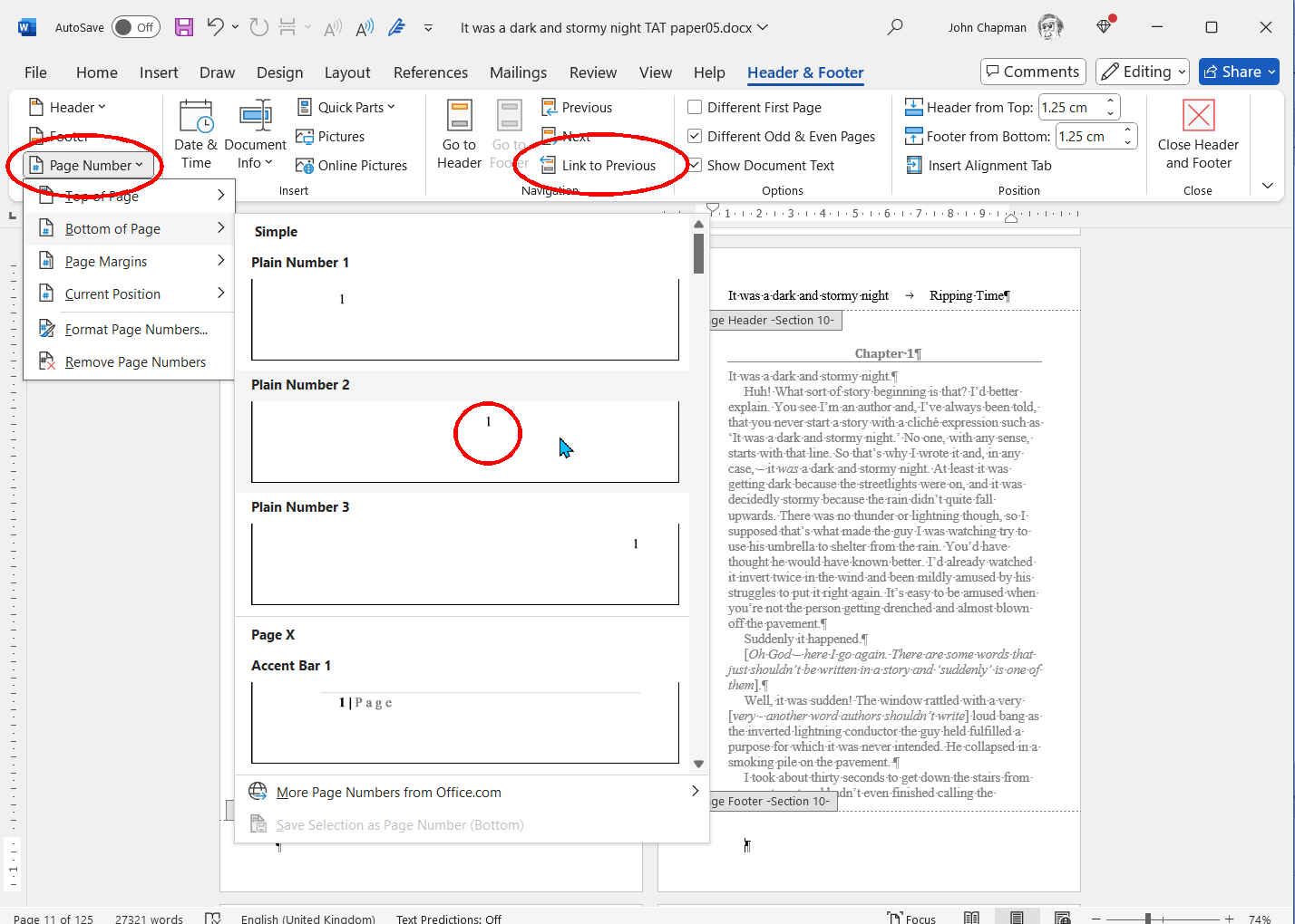 As you can see there are lots of options for placing page numbers. You can place them in a header, a footer,at the left, centre or right and create fancy page numbers if you wish. I prefer to keep things simple by placing the page number in the footer and centering it. That produces: