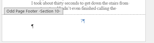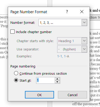 "Hold on a second; didn't I hear you say start the number as '1'" I hear you say. You're right. Word has started counting the page numbers from the very beginning of the book and in my example that works out as page seven. However if you look at the image showing page number options you'll see an entry, 'Format number' Select it and select the button 'Start at:' You can then make sure the page numbering starts at '1'.