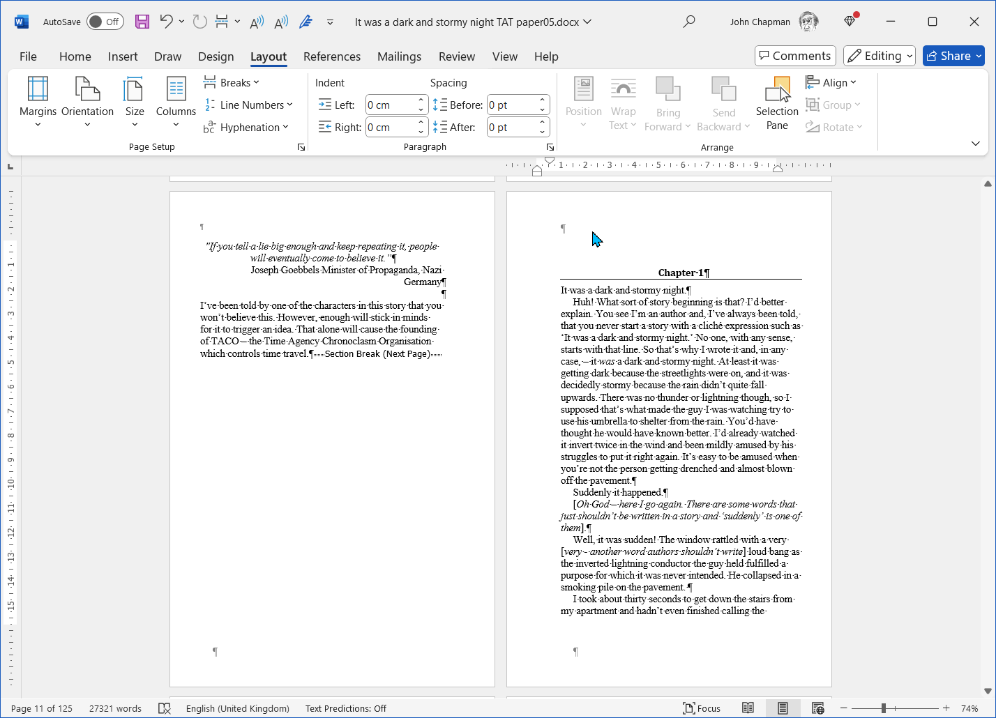 You don't need to regard these as rules however. I have seem many books with author name on the right, others with no author name but book title on the left and chapter title on the right. I have seen books with no headers at all and others with page numbers at the top. In my example below I put my author name at the top left and since the example is a collection of short stories, I put the book title and short story title on the right.