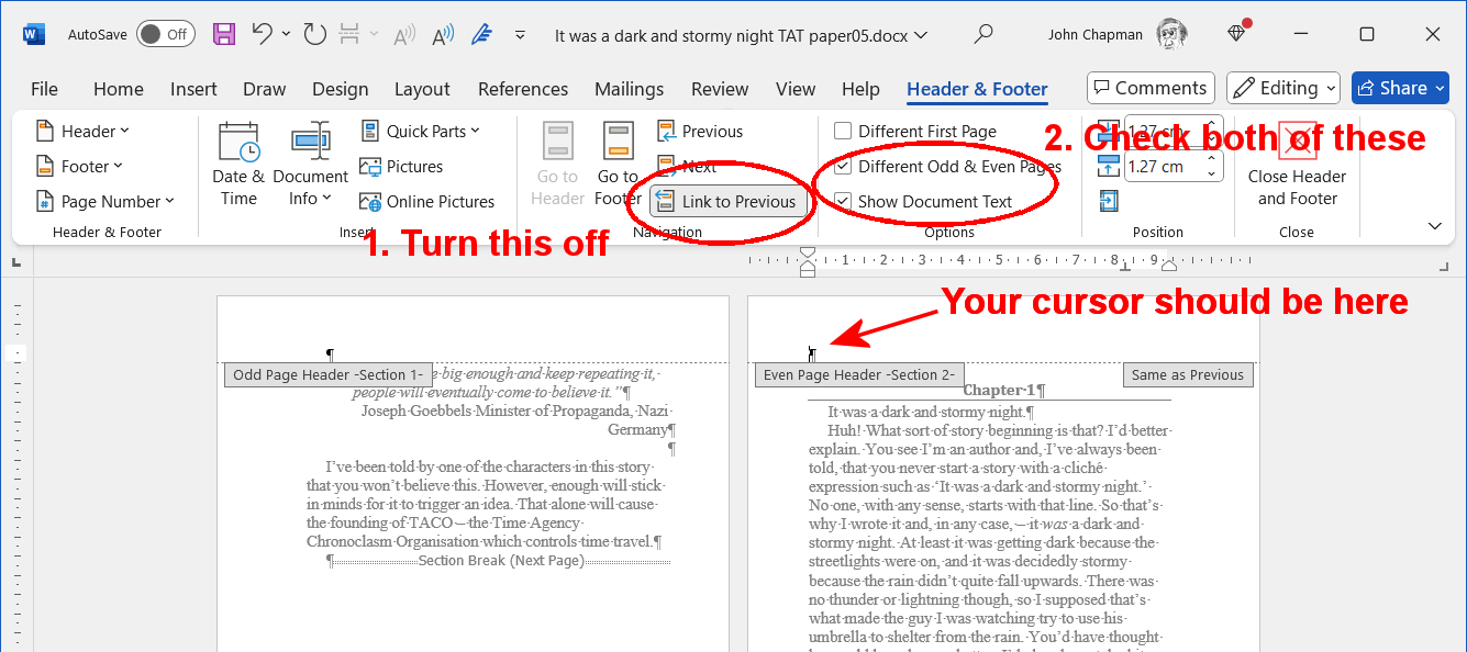 You should now see that you are in a different toolbar - the Header & Footer toolbar. You can now edit the area as you would normal text but first make sure that you have turned off the 'Link to Previous' button and that 'Different odd & even pages' and 'Show document text' are both checked.