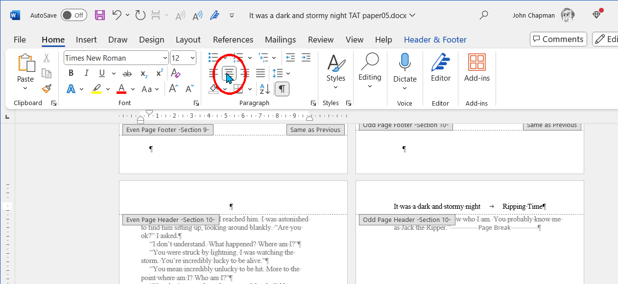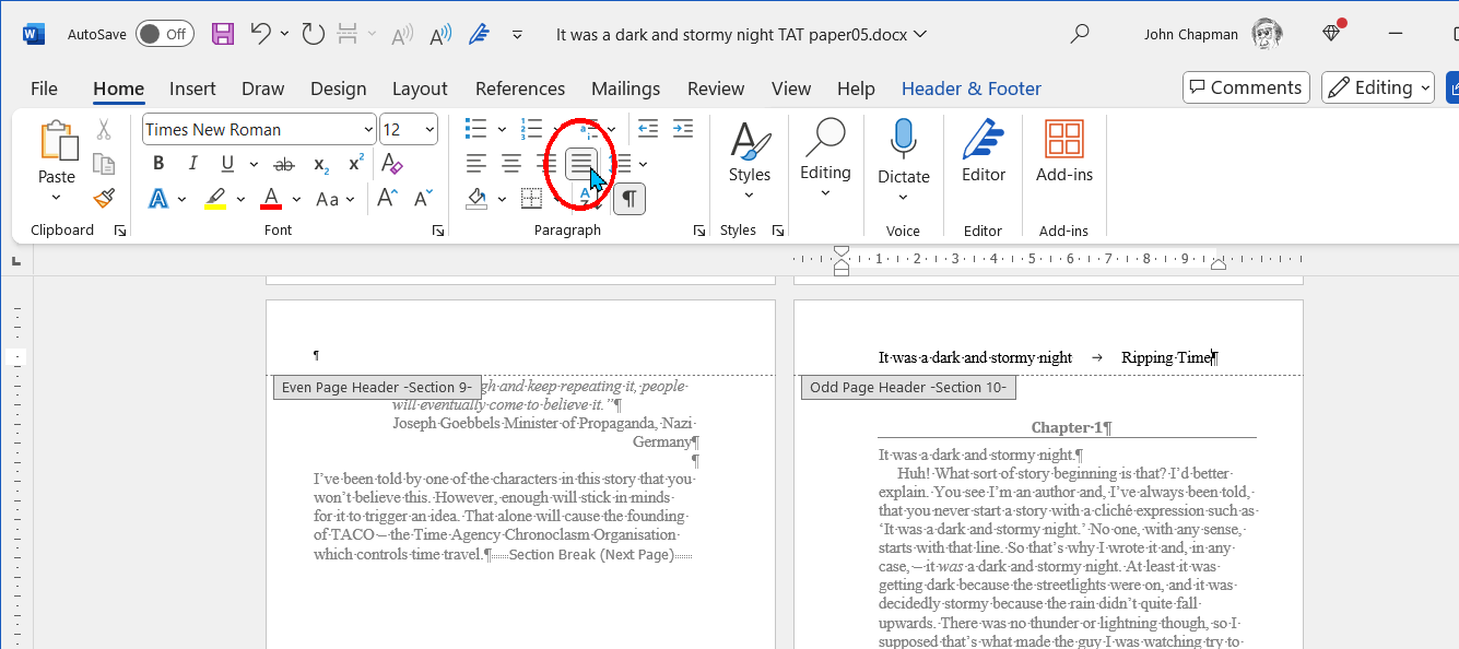 At the left of the header I'm going to put the book title 'It Was a Dark and Stormy Night', I then press the tab key and enter the short story title 'Ripping Time'. Finally I click the 'Justify' icon (circled) of the Home toolbar to fully justify the header.