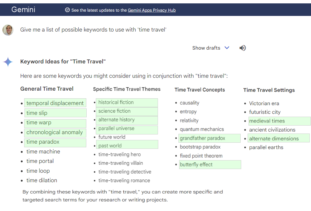 Here's the process I use to update the keywords. I start by using AI. In this case I was looking for keywords for my time travel short stories. I've hilighted the keywordsI selected from the artificial intelligence choices.